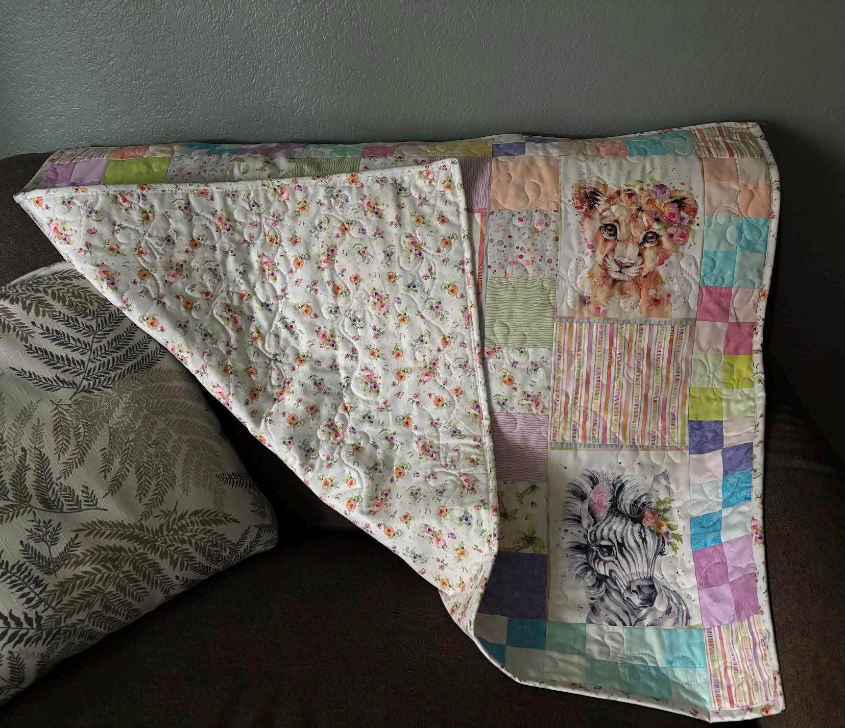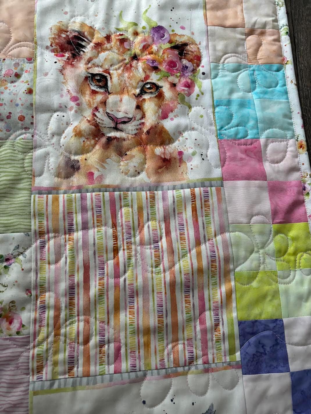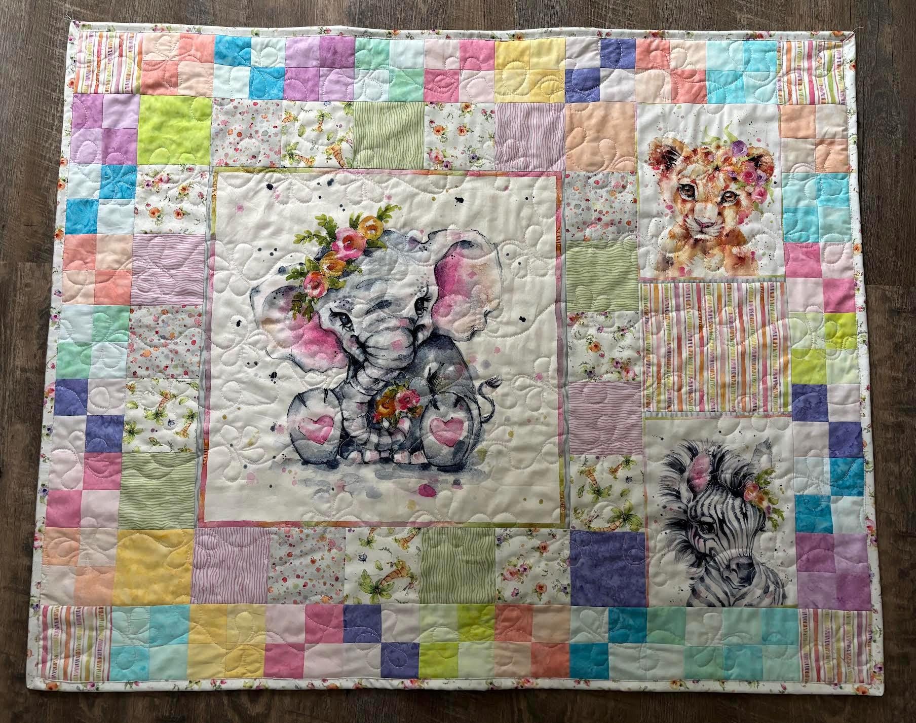 Fun and playful design, this sweet baby quilt is made with Little Darlings fabric with adorable baby elephant, zebra and lion in watercolor style fabric and bright pastel colors. This 41”x34” baby quilt is handmade, one of a kind and perfect for your little one’s room.